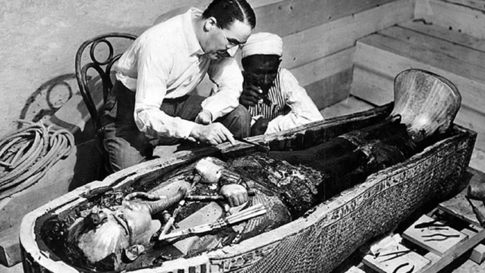 La tumba fue descubierta en el Valle de los Reyes en 1922 por un equipo mayoritariamente egipcio liderado por Carter. Sin embargo, las tareas de limpieza y catalogación se prolongaron durante años, retrasando la apertura del sarcófago hasta tres años después del hallazgo inicial.