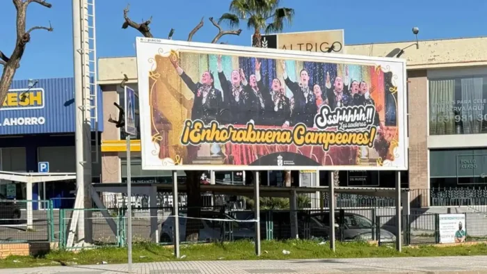 El Ayuntamiento de San José de la Rinconada ha instalado una gran valla publicitaria en una de las principales avenidas de la ciudad para felicitar a la chirigota de *El Bizcocho*.