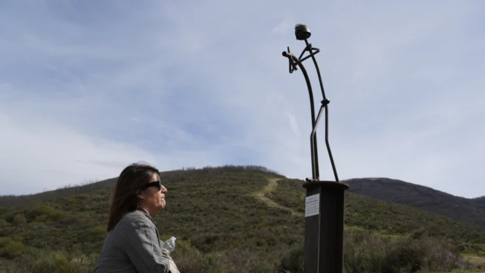 El monumento de acero representa a un bombero forestal con una manguera y lleva una placa con la inscripción: “En memoria de Ignacio Rumbao Domínguez.