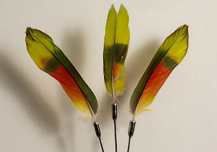 Con estas plumas, Conlon crea exvotos y talismanes que evocan aves como el guacamayo, antaño consideradas sagradas y ahora en peligro de extinción. Una cúpula de cristal, habitualmente utilizada para proteger flores secas, contiene numerosas plumas de un mismo pájaro encontrado al borde del camino, sugiriendo la muerte del animal.