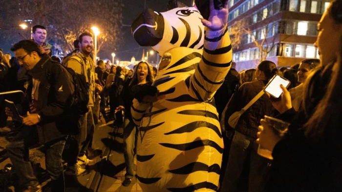 Péter Magyar, con música épica a todo volumen y una bandera húngara al hombro, inicia el recorrido desde el hotel que le sirvió de base hasta el escenario a espaldas del Danubio y el Parlamento. Muchos lloran emocionados. Es el fin de la era Orbán. 10 minutos después, cuando acaba su discurso de victoria, se desatala la fiesta por toda la ciudad.