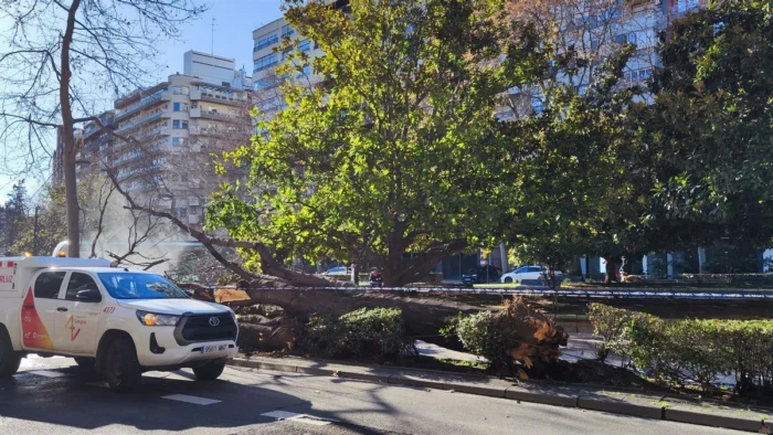 Las fuertes rachas de viento provocaron la caída de un árbol de grandes dimensiones en el Paseo Constitución, a la altura del cruce con la calle Mariano Escar. Afortunadamente, no se reportaron heridos ni daños a los magnolios cercanos. El incidente ocurrió antes de las 10:00 horas. Una patrulla de la Policía Local cortó el tráfico mientras los servicios de limpieza retiraban las ramas caídas sobre la calzada, dando paso controlado a los vehículos por el carril derecho.