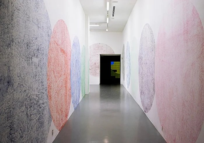 Los murales que integran “Jóvenes ocultos” se extienden por todas las paredes de la galería. En ellos, se observan movimientos sutiles y grandes círculos que remiten al Hombre de Vitrubio o al arte concreto.